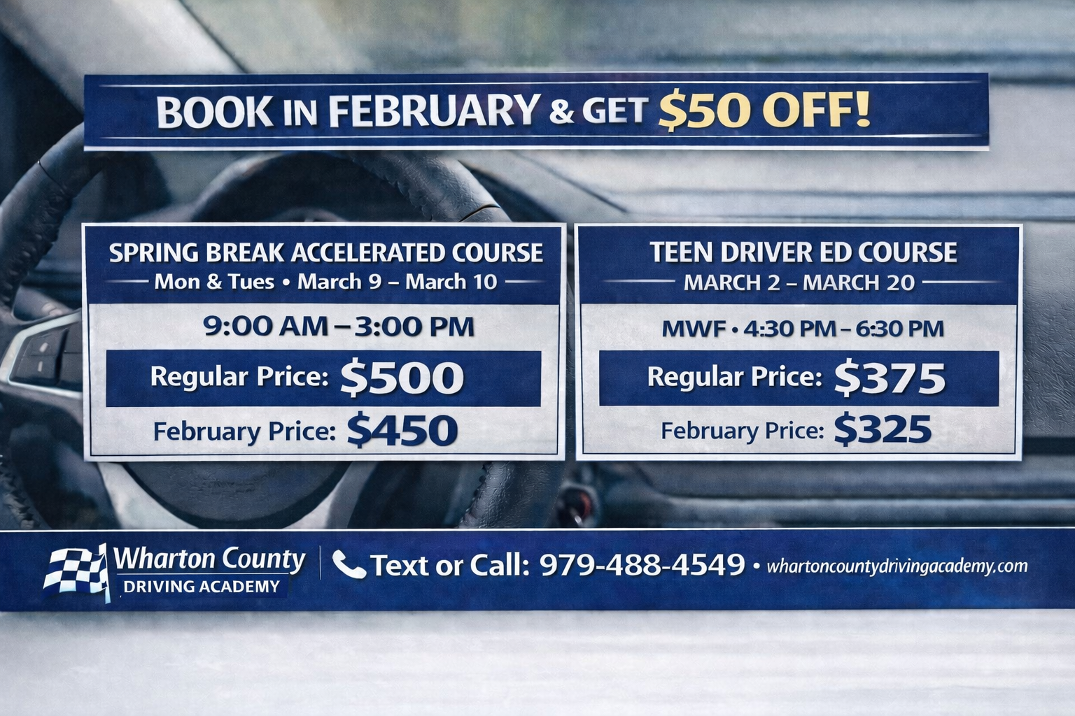 *The Accelerated Course classroom portion is completed in only 2 days. Behind-the-wheel hours, however, will be spread out over multiple days to meet the full Texas Department of Licensing and Regulation (TDLR) requirements for teen driver education.