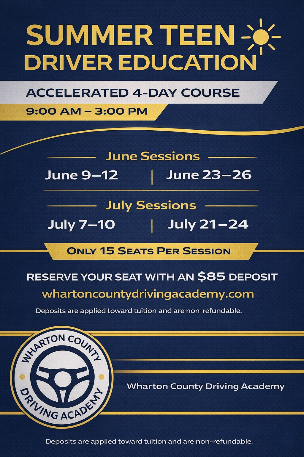 Wharton County Driving Academy requires a minimum of 4 students per class. If the minimum is not met, students will be automatically moved to the next available class session.